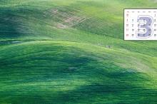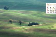 2019年3月辽阔的草原风光日历壁纸,地势平坦而辽阔,在远方有微微起伏,整个大地都被绿油油的草覆盖着,像铺了一层厚厚的地毯,在蓝天的映衬下,显得格外清新。