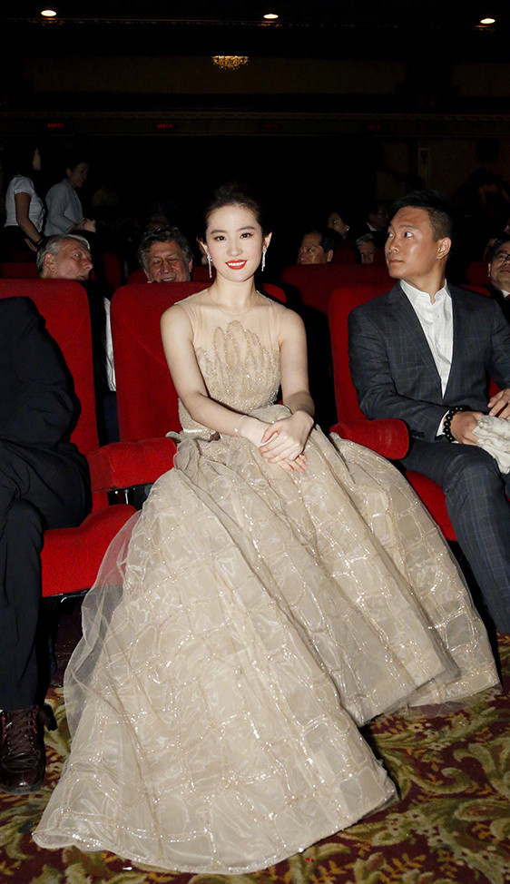 刘亦菲金色礼服裸肩长裙仙气写真