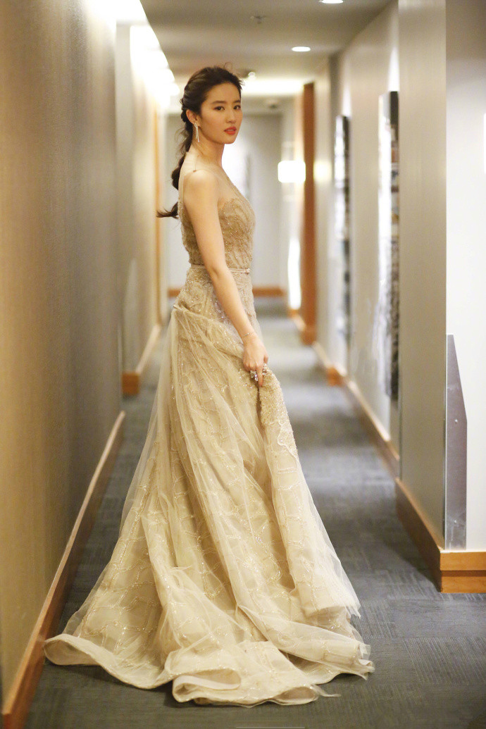 刘亦菲金色礼服裸肩长裙仙气写真