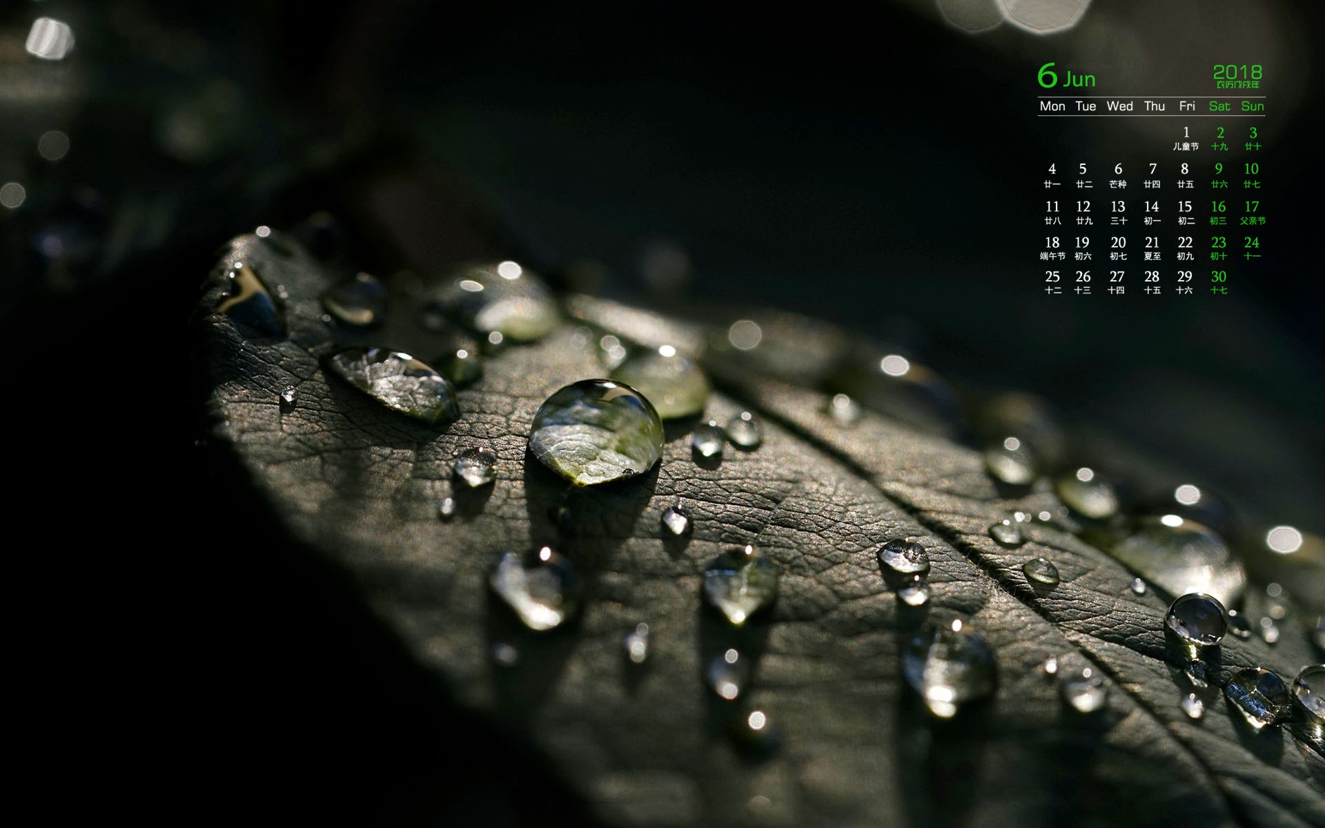 2018年6月绿叶上的露珠唯美日历