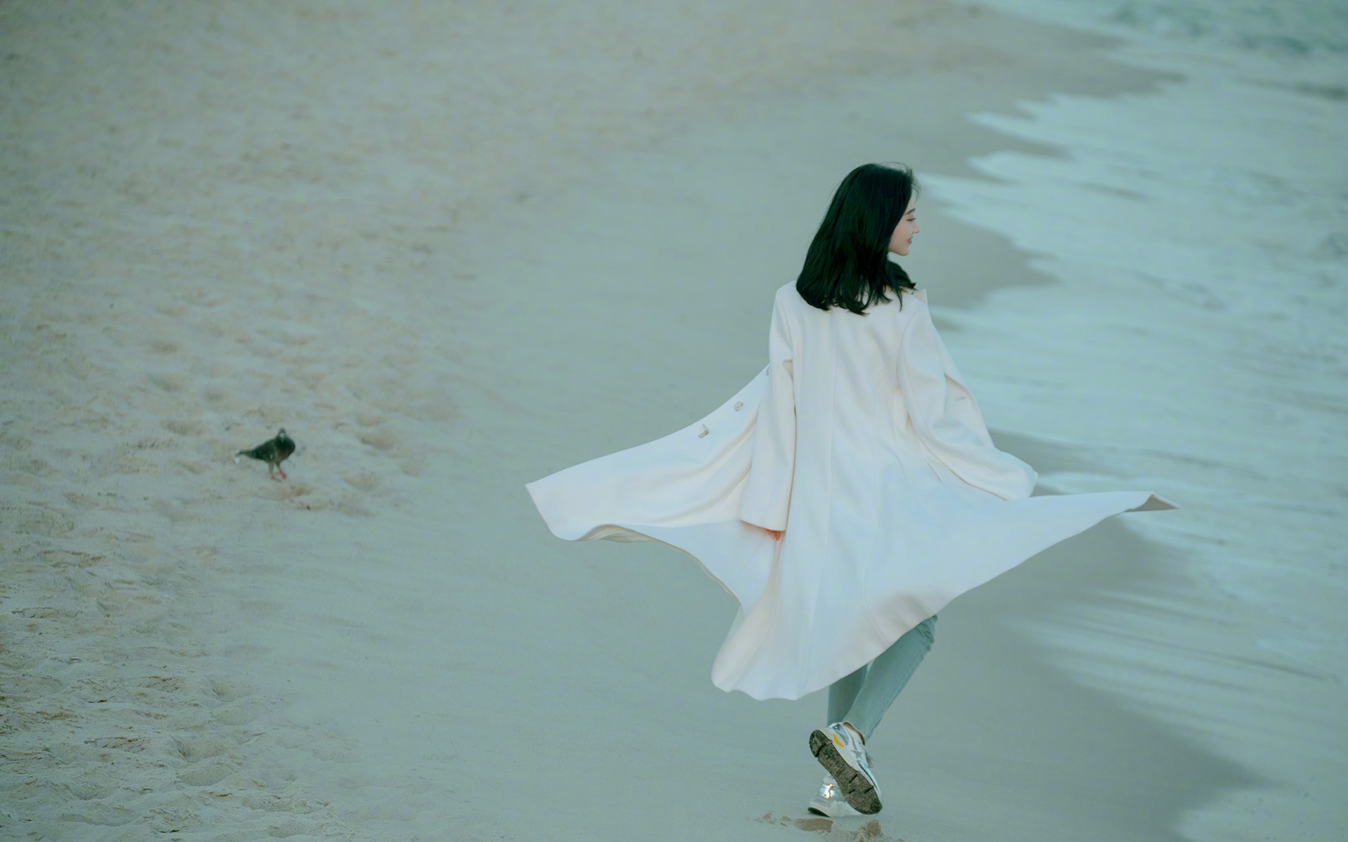 景甜白色大衣海边迷人写真
